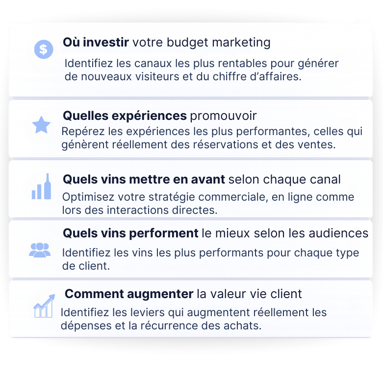 Vintrail transforme chaque interaction, visites, achats, adhésions, partenaires, en insights clairs et connectés.